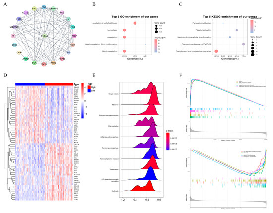 Functional analysis of F13A1. (A) Top twenty most relevant proteins of F13A1. (B) Bubble diagram of the top five functional enrichment analyses of F13A1-related proteins from GO enrichment analysis. (C) Bubble diagram of the top five functional enrichment analyses of F13A1-related proteins from KEGG enrichment analysis. (D) Heatmap of differential genes between the high- and low-F13A1 expression group. (E) The mountain map shows the top ten most significant pathways in the GSEA analysis of differential genes. (F) The top five most significant pathways in the GSEA analysis results of up-regulated genes and down-regulated genes.
