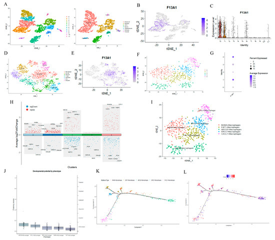 Single-cell analysis of F13A1. (A) Cell clustering and identification by tSNE in GSE84465. (B) Localization of F13A1 in cell population. (C) Expression level of F13A1 in each cluster. (D) Cell clustering and identification of immune cells. (E) Localization of F13A1 in immune cells. (F) Cell clustering and identification of macrophages. (G) Expression level of F13A1 in macrophage subpopulation. (H) The top 5 most significant differential genes in each macrophage subpopulation. (I) Distribution of macrophage subpopulations. (J) CytoTRACE score of each macrophage subpopulation. (K) Trajectory analysis of macrophages. (L) Trajectory analysis of F13A1.