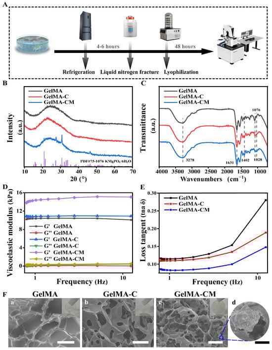 At room temperature, a photoinitiator, MPC powder, and CMCS powder were added into the GelMA. The pre-gel mixture was heated in a water bath at 60–70 °C until the GelMA dissolved completely. The mixture can remain liquid in a water bath at 37 °C. As shown in Figure 2A, the samples underwent three processes before testing: pre-cooling, liquid nitrogen fracture, and lyophilization. The composition of the composite was confirmed by FT-IR (Figure 2C) and XRD (Figure 2B) analysis. The presence of C-O-C stretching and differences in the C-H stretching and bending regions, compared to gelatin, suggest the existence of the methacrylate group in the GelMA monomer [22]. Additionally, the shift of the amide I peak to 1076 cm⁻1 provides evidence for the formation of amide linkages. After the addition of carboxymethyl cellulose, the hydroxyl O-H stretching vibration signal increased at 3278 cm⁻1, the antisymmetry and symmetry of COO⁻ at 1637 and 1402 cm⁻1, and the cellulose C-O at 1028 cm⁻1. After the addition of MPC, the antisymmetric telescopic vibration signal of phosphate PO43⁻ was increased to 1028 cm⁻1. The diffraction peak positions in the sample are essentially consistent with those in the standard PDF card of MPC, confirming the presence of hexahydrated magnesium phosphate (KMgPO4·6H2O).