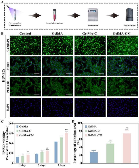 Effects of GelMA, GelMA-C, and GelMA-CM on cytocompatibility in vitro. (A) Schematic diagram of extract preparation. (B) The effect of samples on HUVEC adhesion and proliferation. In live/dead staining, green staining was used for live cells, while red staining was used for dead cells. Phalloidin staining and DAPI staining were used to visualize living and stationary cells in blue. (C) In vitro viability evaluation of rBMSCs in GelMA hydrogel at 1, 3, and 7 days. (D) Quantitative analysis of adhesion area. Scale bars are 100 µm. Results are expressed as the mean ± SD of triplicate experiments: ++ p < 0.01, and +++ p < 0.001 indicate significant differences compared to the GelMA group. ## p < 0.01, and ### p < 0.001 indicate significant differences compared to the GelMA-C group.