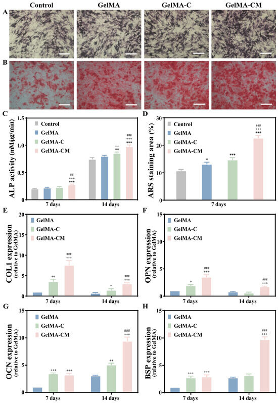 Effects of GelMA, GelMA-C, and GelMA-CM on osteogenic differentiation in vitro. (A) ALP staining and (C) quantitative analysis of bone marrow mesenchymal stem cells co-cultured for 14 days. (B) Alizarin red staining and (D) quantitative analysis of cells cultured for 7 days. (E–H) Expression of bone-related genes on the GelMA, GelMA-C, and GelMA-CM hydrogels for 7 days and 14 days, respectively. Scale bars are 100 µm. Results are the mean ± SD of triplicate experiments: + p < 0.05, ++ p < 0.01, and +++ p < 0.001 indicate significant differences compared to the GelMA group. ## p < 0.01, and ### p < 0.001 indicate significant differences compared to the GelMA-C group. * p < 0.05, ** p < 0.01, and *** p < 0.001 indicate significant differences as compared with the control group.