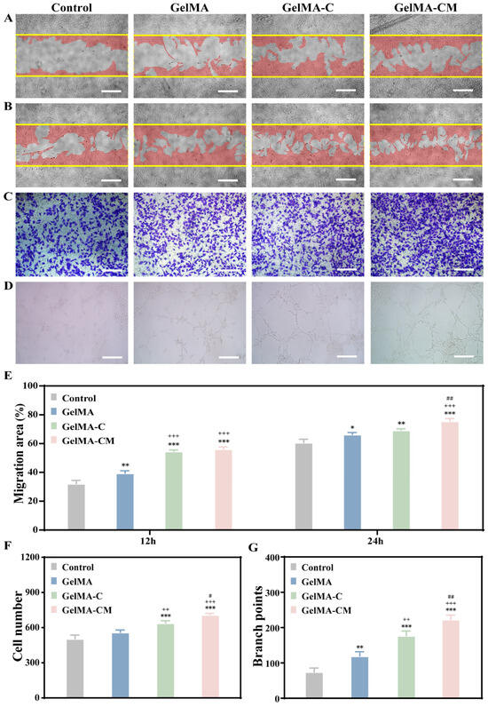 Effects of GelMA, GelMA-C, and GelMA-CM on angiogenesis in vitro. (A,B) Results of 12 and 24 h scratch experimental and (E) quantitative analysis. (C) Transwell results and (F) quantitative analysis of bone marrow mesenchymal stem cells co-cultured with composite extract. (D) Tube formation assay after 8 h of co-culture of MSCs and material extract. (G) The number of branch points in tube formation. Scale bars are 100 µm. Results are the mean ± SD of triplicate experiments: ++ p < 0.01, and +++ p < 0.001 indicate significant differences compared to the GelMA group. # p < 0.05, and ## p < 0.01 indicate significant differences compared to the GelMA-C group. * p < 0.05, ** p < 0.01, and *** p < 0.001 indicate significant differences as compared with the control group.