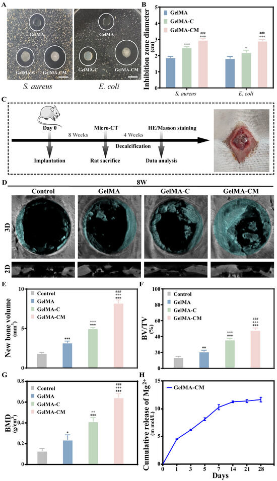 Effects of GelMA, GelMA-C, and GelMA-CM on antibacterial properties and osteogenesis in vivo post-surgery for 8 weeks. (A) Digital images and (B) quantitative analysis of inhibition zones for samples. (C) An illustration of the experimental design and the implantation process used to evaluate in vivo osteogenesis. (D) Representative 3D reconstruction micro-CT images. (E–G) Analysis of microstructural parameters such as new bone volume, BV/TV, and BMD, quantitatively. (H) Ion release of magnesium ions in the medium within 4 weeks. Results are the mean ± SD of triplicate experiments: + p < 0.05, ++ p < 0.01, and +++ p < 0.001 indicate significant differences compared to the GelMA group. ### p < 0.001 indicate significant differences compared to the GelMA-C group. * p < 0.05, ** p < 0.01, and *** p < 0.001 indicate significant differences as compared with the control group. Scale bar: (A) 0.4 cm for inhibition zones, (D) 50 μm for 3D images.