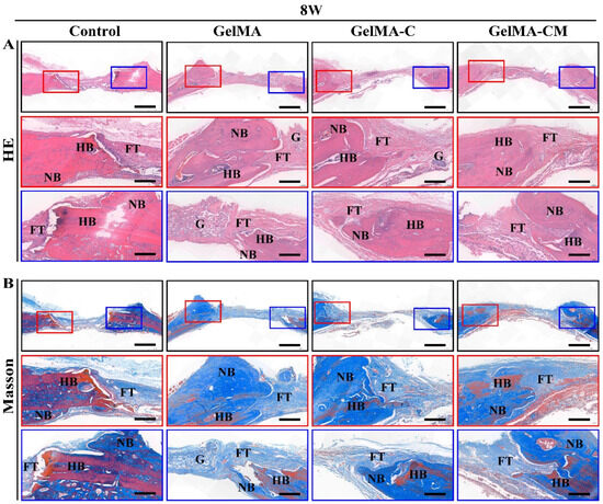 Effects of samples on osteogenesis in vivo post-surgery for 8 weeks. (A) Representative H&E staining images. (B) Masson staining images. The red and blue boxes highlighting and magnifying two different regions, respectively. Scale bar: 500 μm for low magnification and 100 μm for high magnification. (G: GelMA, FT: Fibrous tissues, HB: Host bone tissues, NB: New bone tissues).
