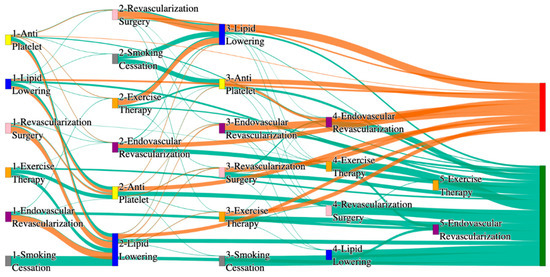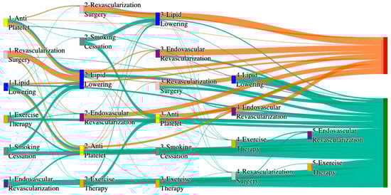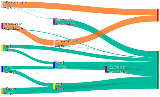 CVD significantly elevates amputation rates compared to general PAD data, especially with less comprehensive treatments. For example, lipid lowering followed by antiplatelet results in the highest amputation rate of 30.77%. However, integrating endovascular revascularization alongside antiplatelet and lipid lowering reduces the amputation rate to 11.54%, which is slightly worse than the general PAD rate of 7.79% for similar sequences. The most effective pathways involve revascularization surgery combined with lipid lowering and antiplatelet, achieving an amputation rate of 7.69%. This comparison underscores the critical importance of surgical interventions in improving outcomes for CVD patients, though the rates remain higher than in the general population.