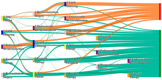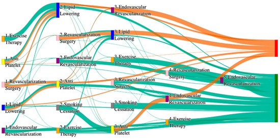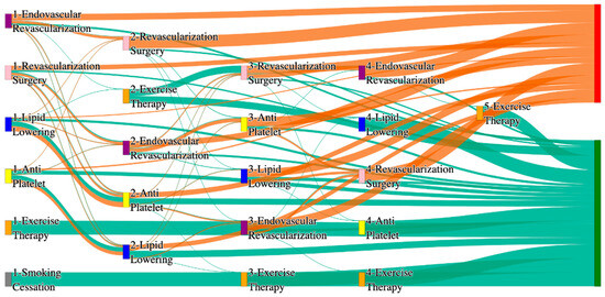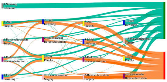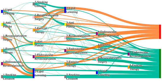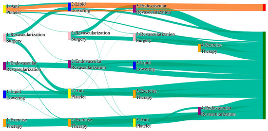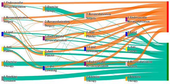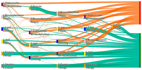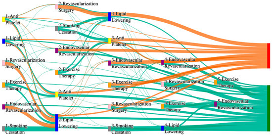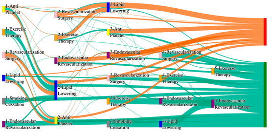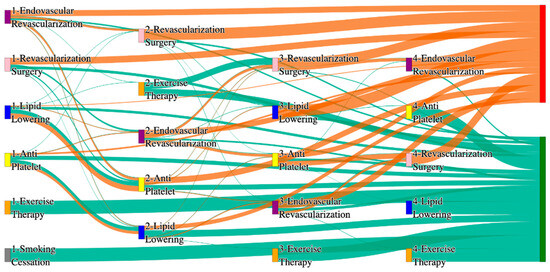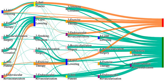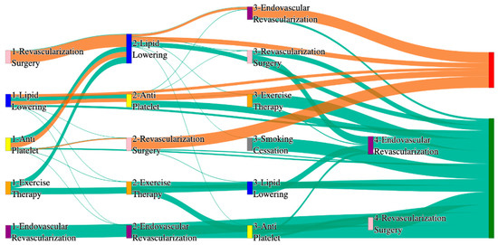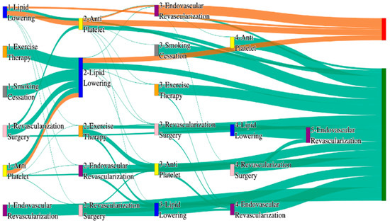 The pathway consisting of lipid-lowering therapy, antiplatelet therapy, and surgical revascularization has an odds ratio of 0.83, indicating a lower likelihood of amputation. This suggests that this treatment sequence is effective in reducing severe outcomes in patients with peripheral artery disease (PAD). Similarly, the combination of antiplatelet therapy, lipid-lowering medication, and surgical revascularization has an odds ratio of 0.81, highlighting its effectiveness in lowering the risk of amputation.