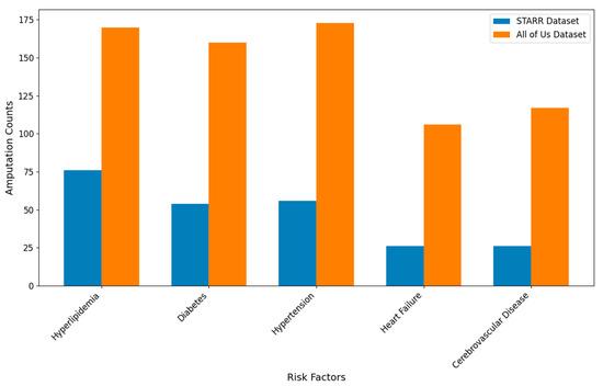 In the STARR dataset, in the cohort of patients aged 80 years or younger, we identified 4613 patients, out of which 58 patients experienced amputations, and 4555 patients experienced no amputations.