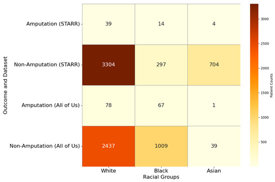 In the STARR dataset, in the cohort of patients who reported their race as white, we identified 3343 patients, out of which 39 patients experienced amputations, and 3304 patients experienced no amputations.