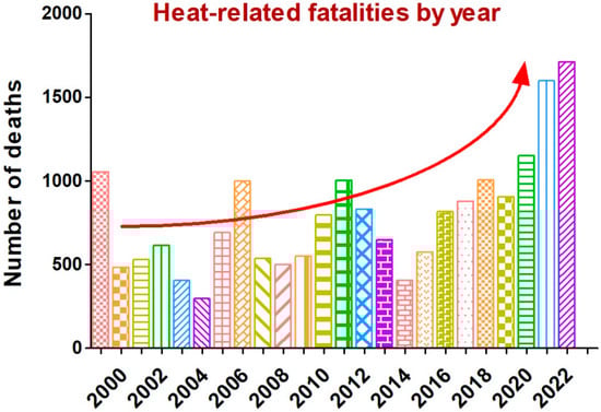 Heat-related fatalities in the United States from the year 1999 to 2022. Data acquired from the Center for Disease Control and Prevention, United States (Accessed on 7 November 2024). The red curved arrow indicates the increase in deaths per year.