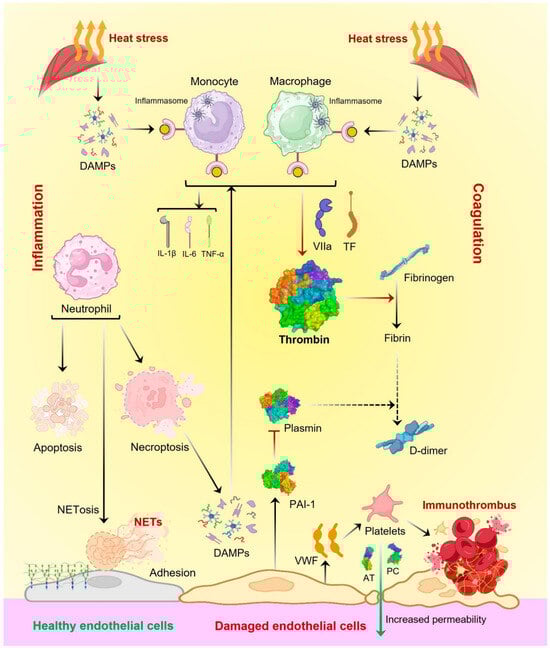 The series of inflammatory response events generated during heatstroke is not fully understood yet and needs to be further studied. Importantly, a coordinated stress response triggered via hyperthermia during heatstroke involving endothelial cells, leukocytes, and epithelial cells plays a role in cell repair and protection against tissue damage. This response is regulated by the heat-shock protein family and ultimately results in altered levels of pro-inflammatory and anti-inflammatory cytokines in plasma and tissues [,]. In the case of long-term hyperthermia, this inflammatory response becomes uncontrolled and results in acute physiological conditions such as hypoxia, circulatory failure, and higher metabolic demands along with direct heat-associated cytotoxicity [,]. Next, the heatstroke-associated inflammatory response is equivalent to the systemic inflammatory response syndrome (SIRS). Interestingly, SIRS is regulated by circulating messenger RNAs that stimulate the release of cytokines and high-mobility group box 1 protein (HMGB1), which in turn causes the overactivation of leukocytes (monocytes, and macrophages) and endothelial cells. Further, cytokines play an important role in heatstroke-associated inflammatory response, which is also connected with SIRS. Notably, an increased circulatory concentration of cytokines including IL-1α, IL-1β, soluble IL-6 receptor (sIL-6R), IL-6, IL-8, IL-10, IL-12, IFN-γ, tumor necrosis factor (TNF-α), and sTNFR has been reported during the heatstroke and becomes normal shortly after cooling []. Next, inflammatory cytokines activate neutrophils to stimulate apoptosis, necroptosis, and NETosis. As a result, heat-induced tissue injury generates damage-associated molecular patterns (DAMPs), along with neutrophil extracellular traps (NETs) that stimulate immune cells to produce inflammatory cytokines and vice versa via inflammasomes. Furthermore, ruptured adhesive neutrophil damage and NETs simultaneously damage the endothelial cells and induce thrombosis. Concurrently, activated immune cells expressed tissue factors (TFs) and factor VIIa that induce coagulation. Coagulation torrent generates thrombin, a demanding mediator of disseminated intravascular coagulation (DIC) that is sequentially involved in inflammation progression and coagulation which finally results in endothelial cell damage via the formation of immunothrombus (Figure 3). Further, endothelial cell damage reduces fibrinolysis by activated plasminogen activator inhibitor 1 (PAI-1) generation and enhanced permeability that results in reduced availability of natural anticoagulants such as antithrombin (AT) and protein C (PC). At the same time, damaged endothelial cells secrete von Willebrand factor (VWF) that induces platelet aggregation and finally the formation of an inflammatory thrombus (Figure 3). Overall, SIRS with other associated immune modulation during heatstroke causes DIC, leading to multiple organ failure, and even death (Figure 3) [,]. Additionally, the gut–brain barrier becomes permeable during heatstroke, allowing the migration of bacterial endotoxins and lipopolysaccharides to the circulatory system and ultimately to the brain, which causes neuroinflammation []. In conclusion, endotoxemia and enhanced LPS levels are suggested to be involved in the induction of inflammatory response during heatstroke []. Disruption of the gut–brain axis and increased intestinal permeability have already been observed in exertional hyperthermia; however, the detailed mechanism is not well understood [,]. Overall, the function of cytokines in SIRS, DIC, and the role of gut–brain axis dysbiosis in heatstroke need to be further explored.