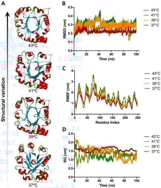 Molecular dynamics simulation analysis of trios phosphate isomerase (PDB: 8TIM) at different temperatures to demonstrate the structural variations. (A) The solid ribbon structures of trios phosphate isomerase at 37 °C, 39 °C, 41 °C, and 43 °C from bottom to top, respectively. (B) RMSD, (C) RMSF, and (D) RG values of trios phosphate isomerase during a 100 ns molecular dynamics and simulation experiment at 37 °C, 39 °C, 41 °C, and 43 °C, respectively. The maroon line shows the values at 37 °C which are consistent in comparison to at the higher temperatures.