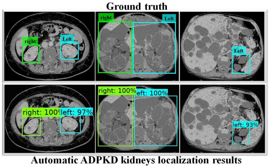 Figure 9, our localization model accurately localizes the left kidney (i.e., blue box) and right kidney (i.e., green box) with a high confidence score. Despite the presence of liver cysts, our model successfully localizes the ADPKD kidneys by predicting the bounding boxes, although some parts of adjacent organs, like the liver and spleen, may also be included within the detected box. To address this limitation, we further proposed an automatic ADPKD segmentation model.