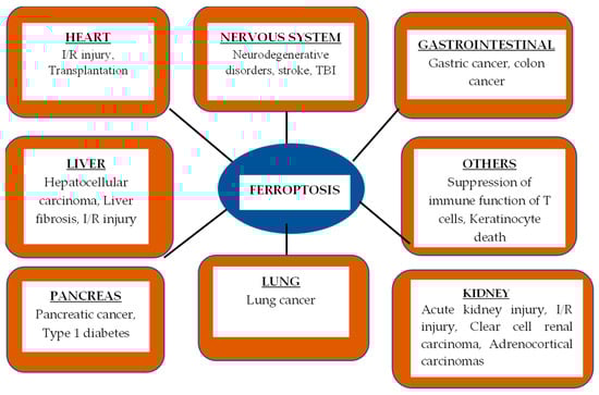 Ischemia/reperfusion injury (IRI): Ischemia/reperfusion injury (IRI)-induced ferroptosis has been reported in the kidney, liver, gut, brain, and heart [73,76,77,78]. The effectiveness of anti-ferroptosis agents in preventing acute kidney injury is demonstrated by a number of FDA-approved drugs in addition to liproxstatin-1, including rifampicin, promethazine, omeprazole, indole-3- carbinol, carvedilol, propranolol, estradiol, and thyroid hormones that have lipid peroxyl radical-scavenging properties [76]. Ferroptosis also contributes to hemopoiesis caused by seizures, stroke, and traumatic brain injury (TBI) [79].