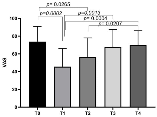 At T0, the mean VAS score was 73.75 ± 17.08, decreasing to a mean of 45.63 ± 20.4 at T1. The mean VAS score increased slightly at T2 (56.56 ± 21.43), T3 (67.81 ± 19.66), and T4 (70 ± 16.12). Tukey’s multiple comparisons test showed significant differences between VAS T0 and VAS T1 (p = 0.0002), and VAS T0 and VAS T2 (p = 0.0265). Other significant differences emerged between VAS T1 and VAS T3 (p = 0.0013), VAS T1 and VAS T4 (p = 0.0004), and VAS T2 and VAS T4 (p = 0.0207) (Figure 1).