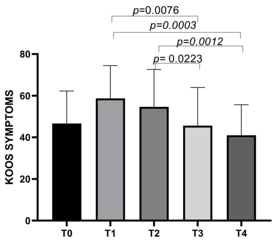 The KOOS symptoms subscale showed a mean score of 46.66 ± 15.61 at T0, increasing to a mean of 58.07 ± 15.74 at T1, then decreasing to means of 54.64 ± 17.96 at T2, 45.64 ± 18.31 at T3, and 40.99 ± 14.71 at T4. Statistically significant differences emerged between T1 and T3 (p = 0.0076), T1 and T4 (p = 0.0003), T2 and T3 (p = 0.0223), and T2 and T4 (p = 0.0012) (Figure 2).