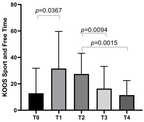 The KOOS Sport and Free Time subscale started with a mean score of 12.81 ± 18.97 at T0, increasing to a mean of 31.56 ± 28.09 at T1 before decreasing to means of 27.44 ± 15.68 at T2, 16.38 ± 16.8 at T3, with a final mean of 11.44 ± 10.97 at T4. Statistically significant differences emerged between T0 and T1 (p = 0.0367), T2 and T3 (p = 0.0094), and T2 and T4 (p = 0.0015) (Figure 3).