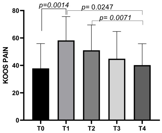 The KOOS Pain subscale had a mean score of 37.8 ± 18.08 at T0, increasing to a mean of 58.21 ± 17.42 at T1 before decreasing to means of 51.01 ± 18.5 at T2, and further decreasing to means of 44.86 ± 19.87 at T3 and finally to a mean score of 40.22 ± 15.59 at T4. Statistically significant differences emerged between T0 and T1 (p = 0.0014), T1 and T4 (p = 0.0247), and T2 and T4 (p = 0.0071) (Figure 5).
