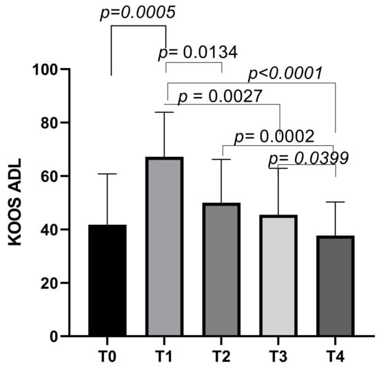 The KOOS ADL subscale had an initial mean score of 41.73 ± 19.04 at T0, which increased to a mean score of 67.21 ± 16.67 at T1 (p = 0.0030). The scores then decreased slightly to means of 49.99 ± 16.22 at T2, and further decreased to means of 45.52 ± 17.39 at T3. The final mean score was 37.68 ± 12.55 at T4. Statistically significant differences emerged between T0 and T1 (p = 0.0005), T1 and T2 (p = 0.0134), T1 and T3 (p = 0.0027), T1 and T4 (p < 0.0001), T2 and T4 (p = 0.0002), and T3 and T4 (p = 0.0399) (Figure 6).