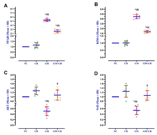 Interleaved scatter plots presenting the mean ± SD of the relative expression of NF-kB (A), KIM-1 (B), AKT (C), and Nrf2 (D) in the renal tissues obtained from the GM and GM + CH groups compared with their relative expression in the NC and CH groups. Dots, triangles, stars, and asterisks indicate the values of NF-kB, KIM-1, AKT, and Nrf2 for the rats in each group (n = 8). Red error bars represent the ± standard deviation of the mean, and the blue lines indicate the mean values of the relative expression of these genes in each group. Statistical significance is indicated as follows: * = p < 0.05 compared with the NC group; # = p < 0.05 compared with the CH group; $ = p < 0.05 compared with the positive GM group; and ¥ = p < 0.05 compared with the GM + CH group.