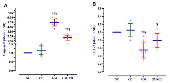 Interleaved scatter plots presenting the mean ± SD of the relative expression of Caspase-3 (A) and BCL-2 (B) in the renal tissues of the GM and GM + CH groups compared with their relative expression in the NC and CH groups. Dots, triangles, stars, and asterisks indicate the values of Caspase-3 and BCL-2 for the rats in each group (n = 8). Red error bars represent the ± standard deviation of the mean, and the blue lines indicate the mean values of the relative expression of these genes in each group. Statistical significance is indicated as follows: * = p < 0.05 compared with the NC group; # = p < 0.05 compared with the CH group; $ = p < 0.05 compared with the positive GM group; and ¥ = p < 0.05 compared with the GM + CH group.