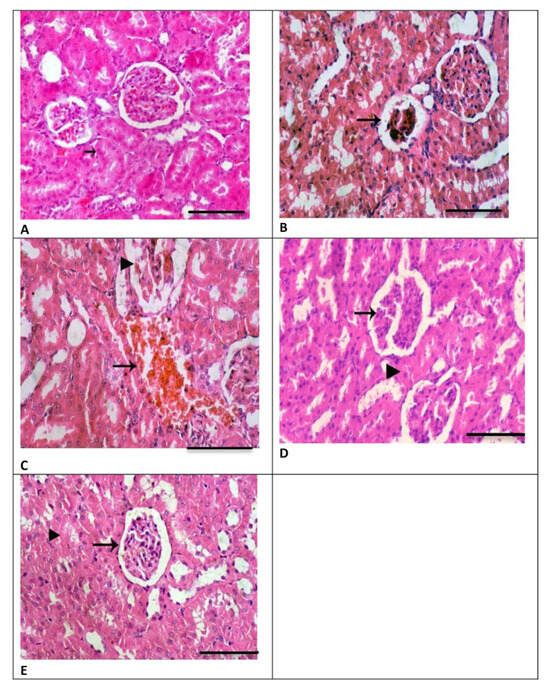Renal histological features in all study groups, visualized via H&E staining (scale bar = 10 µm). (A) In the CH group, the kidney tissue shows normal renal glomeruli and renal tubules with a normal lining epithelium (as indicated by the arrow) (H&E, 400×). (B) In the GM-treated group, the kidney tissue shows the dissolution of renal glomeruli (as indicated by the arrow) (H&E, 400×). (C) In the GM-treated group, the kidney tissue also shows hemorrhaging in the interstitial tissue (as indicated by the arrow) that had replaced renal tubules and degenerative changes in the renal glomeruli (H&E, 400×). (D) In the GM + CH-treated group, the kidney tissue shows normal renal glomeruli (as indicated by the arrow) and cloudy swelling in the renal tubular epithelium (as indicated by the arrowhead). (E) In the GM + CH-treated group, the kidney tissue also shows scattered necrosis of the renal tubular epithelium (as indicated by the arrowhead) and normal renal glomeruli (as indicated by the arrow) (H&E, 400×).