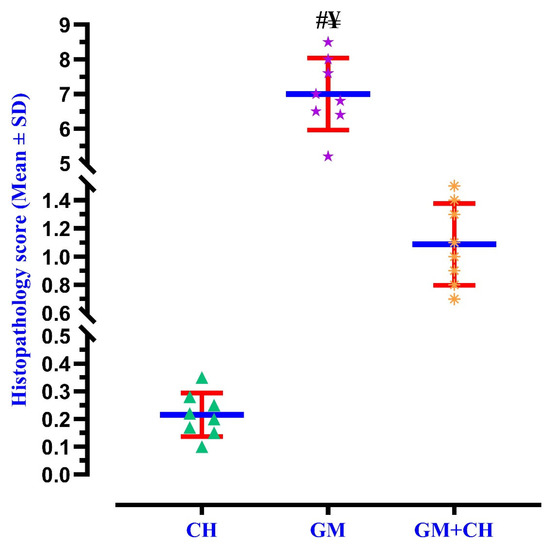 The histopathological damage scores in the renal tissues of all groups, displayed as bars in the graph (data are shown as mean ± SD). Triangles, stars, and asterisks represent the values of histological scores for each rat per group (n = 8), red error bars represent the ± standard deviation of the mean, and the blue line indicates the mean values of histological scores in each group. Statistical significance is indicated as follows: # = p < 0.05 compared with the CH group; and ¥ = p < 0.05 compared with the GM + CH group.