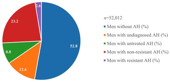A total of 52,012 men were examined between 2009 and 2019 as part of the prevention program. Of these, 52.8% (n = 27,481) had no diagnosis of arterial hypertension. In 12.6% (n = 6583) of cases, arterial hypertension was detected during screening, while 8.8% (n = 4555) had been previously diagnosed but did not receive treatment. In addition, 23.2% (n = 12,059) of cases were diagnosed and responded to treatment, with 2.6% (n = 1334) of participants having resistant arterial hypertension (Figure 1). The overall prevalence of arterial hypertension in male participants was 47.2%, and 74.6% of these patients, excluding newly diagnosed cases, were on treatment. Of the treated cases, 9.96% developed resistant arterial hypertension.