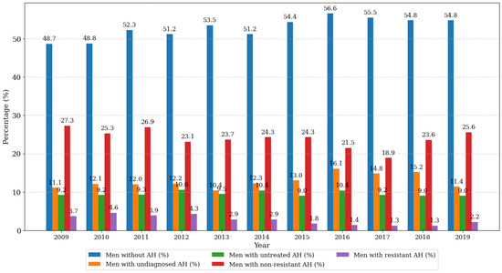 There was a stable and significant increase in the proportion of men without arterial hypertension, rising from 48.7% in 2009 to 54.8% in 2019 (p < 0.001). From 2018, there was also a notable decrease in untreated cases of diagnosed arterial hypertension and an increase in non-resistant forms (p < 0.001) (Figure 2, Table S1).