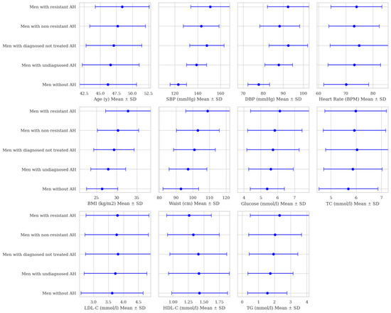 Mean glucose levels also significantly increased from 5.38 ± 1.01 mmol/L in men without arterial hypertension to 6.12 ± 1.74 mmol/L in men with resistant arterial hypertension (p < 0.001). Mean triglyceride levels increase from 1.55 ± 1.22 mmol/L in men without arterial hypertension to 2.32 ± 1.82 mmol/L in those with resistant arterial hypertension (p < 0.001). Differences in mean LDL cholesterol levels in most groups with arterial hypertension were insignificant (p > 0.05). Meanwhile, changes in HDL cholesterol were insignificant comparing only groups with newly diagnosed and untreated arterial hypertension cases (p = 0.464) (Figure 3, Table S2).
