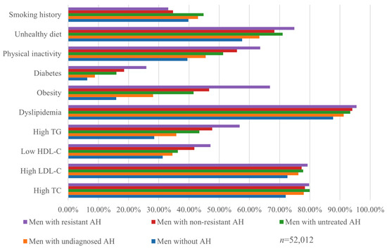 Cardiovascular risk factors in men with and without arterial hypertension. Abbreviations: TG—triglycerides, HDL-C—high-density lipoprotein cholesterol, LDL-C—low-density lipoprotein cholesterol, TC—total cholesterol.
