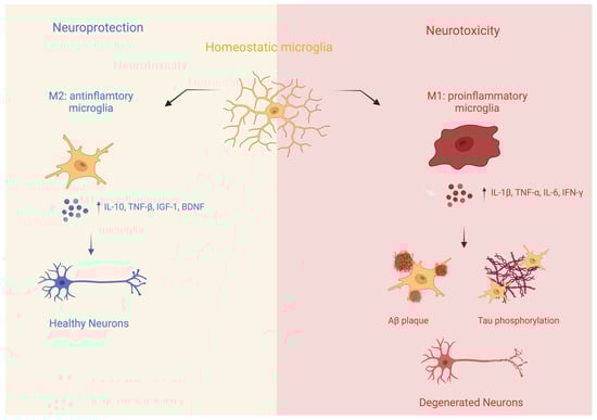 Traditionally, microglial activation has been categorized into pro-inflammatory and anti-inflammatory states. In the pro-inflammatory state, also referred to as the M1 state, microglia are characterized by their production and release of pro-inflammatory mediators, such as cytokines like interleukin-1β (IL-1β) and tumor necrosis factor-α (TNF-α), chemokines, and reactive oxygen species (Figure 1). This type of activation is generally concurrent with neuronal injury and promotes the progression of neurodegenerative diseases.