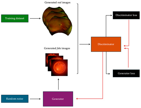Schematic representation of a generative adversarial network architecture applied to ophthalmology. GANs consist of two primary components: a generator and a discriminator. The generator produces synthetic images starting from random noise and aims to generate outputs that resemble real images. Real images are sourced from the training dataset, while the discriminator is tasked with distinguishing between real images and synthetic images created by the generator. The discriminator evaluates each input image and calculates the likelihood of it being real or fake. Feedback, or backpropagation (indicated by red arrows), flows from the discriminator to the generator, allowing the generator to improve its image synthesis over successive iterations. The goal is for the generator to produce images that are indistinguishable from real ones. The fake images shown here were generated using a Stable Diffusion model (accessible at https://app.aitubo.ai/create/ accessed on 10 October 2024). The schematic captures the interplay between the generator and discriminator in a GAN setup, particularly in the context of ophthalmic imaging. The Figure was created based on the cited reference [36].