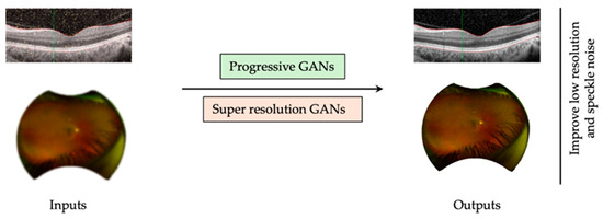 Super-resolution and progressive GANs are specific subtypes of GANs aimed at increasing the resolution of images. However, the structure of these GANs is more dynamic, where resolution is improved progressively through the training process [73,74]. In the field of medical imaging, these types of GANs have applications for improving image quality and decreasing artifacts [62,73,74]. In ophthalmology, image quality improvement can enhance the resolution of images (Figure 3), such as optic disc photography that can be limited by patient cooperation, small pupils, or media opacities [75]. GANs can also improve retinal images taken by a handheld fundus camera in limited imaging conditions [76]. Similarly, in OCT images with low resolution and speckle noise, due to media opacities, which can limit accurate diagnosis, super resolution GANs can output high resolution OCT images allowing better classification [77].