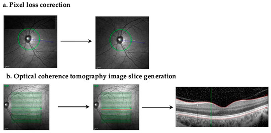 - Lee, H.; Kim, S.; Kim, M.A.; Chung, H.; Kim, H.C. Post-treatment prediction of optical coherence tomography using a conditional generative adversarial network in age-related macular degeneration. Retina 2021, 41, 572–580. [Google Scholar] [CrossRef] [PubMed]