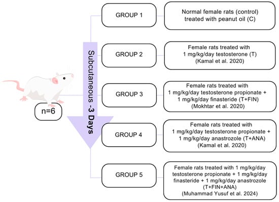 During the proestrus phase, each female rat was mated overnight at a 1:1 ratio with a male of the same species. Successful mating was confirmed the next morning by the detection of sperm in vaginal swabs or the presence of a vaginal plug (referred to as postcoital day 1) [,]. Rats were subsequently allocated randomly to one of five groups (n = 6 per group), as shown in Figure 1 below.