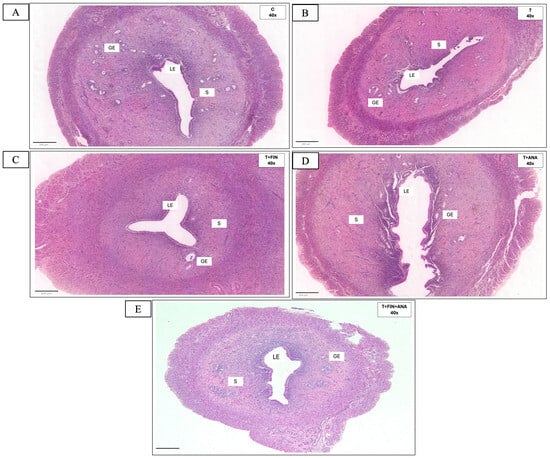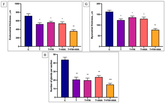 In addition, testosterone significantly reduces the thickness of the endometrium and myometrium, as well as the number of glands, which indicates a disruption of the uterine architecture. The additional administration of finasteride or anastrozole alone does not appear to completely counteract the effects of testosterone on these parameters. The combined treatment (T+FIN+ANA) resulted in the most profound reductions in all parameters, suggesting a stronger inhibitory effect when both the 5α-reductase and aromatase pathways are blocked together with testosterone. These data suggest that both the androgenic and oestrogenic pathways are involved in the maintenance of the uterine structure and that disruption of both pathways can significantly alter tissue morphology. However, there are studies that report that with prolonged administration of testosterone, endometrium histological analysis showed a significant increase in luminal epithelial height and glandular density without changes in cell proliferation. The thickness of the subepithelial stroma and the myometrium also increased in these rats [,].