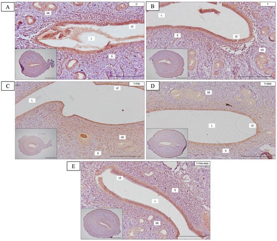 - Muhammad Yusuf, A.N.; Amri, M.F.; Ugusman, A.; Hamid, A.A.; Mokhtar, M.H. Supraphysiological Dose of Testosterone Impairs the Expression and Distribution of Sex Steroid Receptors during Endometrial Receptivity Development in Female Sprague–Dawley Rats. Int. J. Mol. Sci. 2024, 25, 10202. [Google Scholar] [CrossRef]