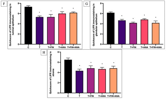 Looking at the glandular epithelium, the control group shows the highest LIFR immunostaining activity. The testosterone-treated group exhibits a substantial reduction in LIFR expression relative to the control group (p < 0.05). A similar pattern can be observed in the other treatment groups with the inhibitors, where LIFR immunostaining is significantly reduced compared to the control group (p < 0.05). The trend is also similar in the stromal compartment, where the control group exhibits elevated LIFR immunostaining activity in the stroma. The expression of LIFR has substantially decreased in the treatment with the testosterone group relative to the control group. Treatment of testosterone with finasteride or anastrozole or a combination of both inhibitors also showed a substantial decrease in LIFR immunostaining, similar to the testosterone-only group (p < 0.05).