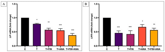 Figure 4A illustrates the expression of LIF mRNA. This study demonstrates that testosterone administration significantly downregulates LIF mRNA expression (p < 0.05) relative to the control groups. The additional administration of finasteride led to a further downregulation of LIF mRNA expression relative to the control group (p < 0.01). LIF mRNA expression was considerably downregulated in the anastrozole treatment group relative to the control group (p < 0.001). A comparable pattern was observed in the group receiving the combination of testosterone with both inhibitors, demonstrating downregulation of LIF mRNA expression while retaining statistical significance (p < 0.001) relative to the control group.