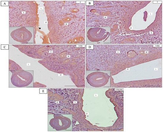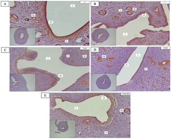Distribution of leukaemia inhibitory receptor (LIFR) in the uterus of rats. (A–E) The antibody binding site of LIFR, which can be seen in the stroma and luminal and glandular epithelium of the uterus, is coloured brown. Compared to the control group, all four treatment groups (T, T+FIN, T+ANA and T+FIN+ANA) showed a lighter brown discolouration in all compartments. (F–H) Semi-quantitative assessment of LIFR immunostaining for the endometrial compartments. LE: Luminal epithelium; GE: Glandular epithelium; L: Lumen of the endometrium; S: Stroma. Scale bar = 200 μm, scale bar insert = 1 mm, magnification 40× and 200×. Error bars represent standard error of the mean (SEM). n = 6 in each group, * p < 0.05 indicates significance relative to the normal control group. C: control; T: testosterone propionate; T+FIN: testosterone propionate + finasteride; T+ANA: testosterone propionate + anastrozole; T+FIN+ANA: testosterone propionate + finasteride + anastrozole.