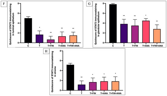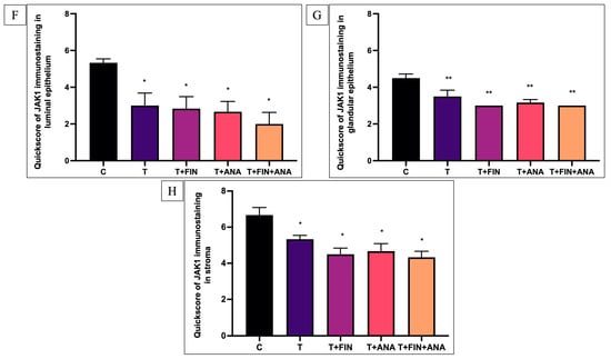 As for the glandular epithelium, the control group again showed the highest JAK1 Quickscore. A statistically significant decrease (p < 0.01) in JAK1 immunostaining was observed in all treatment groups including T, T+FIN, T+ANA and T+FIN+ANA compared to the control group.