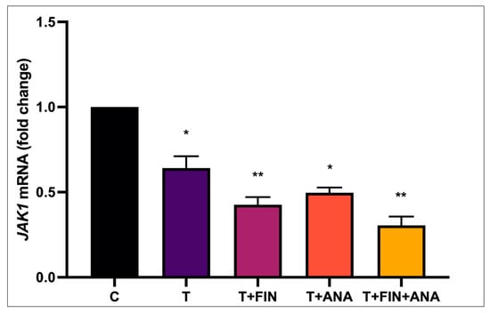 Effects of testosterone on JAK1 mRNA expression. n = 6 in each group, error bars denote the standard error of the mean (SEM). * p < 0.05, ** p < 0.01 indicates significance relative to the normal control group. C: normal control; T: testosterone propionate; T+FIN: testosterone propionate + finasteride; T+ANA: testosterone propionate + anastrozole; T+FIN+ANA: testosterone propionate + finasteride + anastrozole.