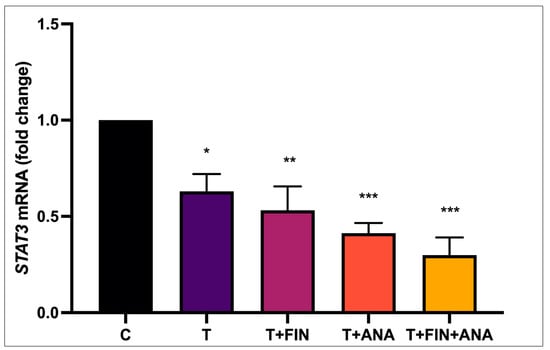 Effect of testosterone on STAT3 mRNA expression. n = 6 in each group, error bars denote the standard error of the mean (SEM). * p < 0.05, ** p < 0.01, *** p < 0.001 indicate significance relative to the normal control group. C: normal control; T: testosterone propionate; T+FIN: testosterone propionate + finasteride; T+ANA: testosterone propionate + anastrozole; T+FIN+ANA: testosterone propionate + finasteride + anastrozole.
