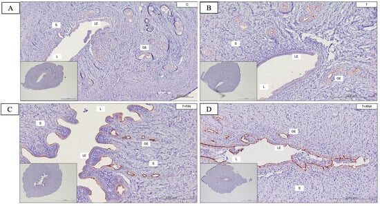 On the evening of the fourth day of gestation, which coincides with the endometrial receptivity phase in rats [], the animals were euthanised by intravenous administration of a high-dose ketamine–xylazine mixture (0.3 mL per 100 g body weight). Uterine tissue was subsequently collected for further analyses focusing on the gene expression and protein distribution of LIF, LIFR, STAT3, JAK1 and MUC1, as well as morphological changes in the uterus.
