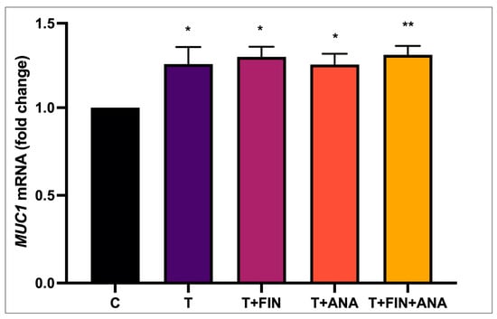 Figure 10 shows the MUC1 mRNA expression. The control group was set as baseline (1.0). The group with testosterone alone (T) and with the addition of the inhibitors (T+FIN and T+ANA) showed a significant upregulation of MUC1 mRNA (p < 0.05). The group with the treatment combination of testosterone + anastrozole + finasteride (T+FIN+ANA) showed a further upregulation of MUC1 expression (p < 0.01) compared to the control group.