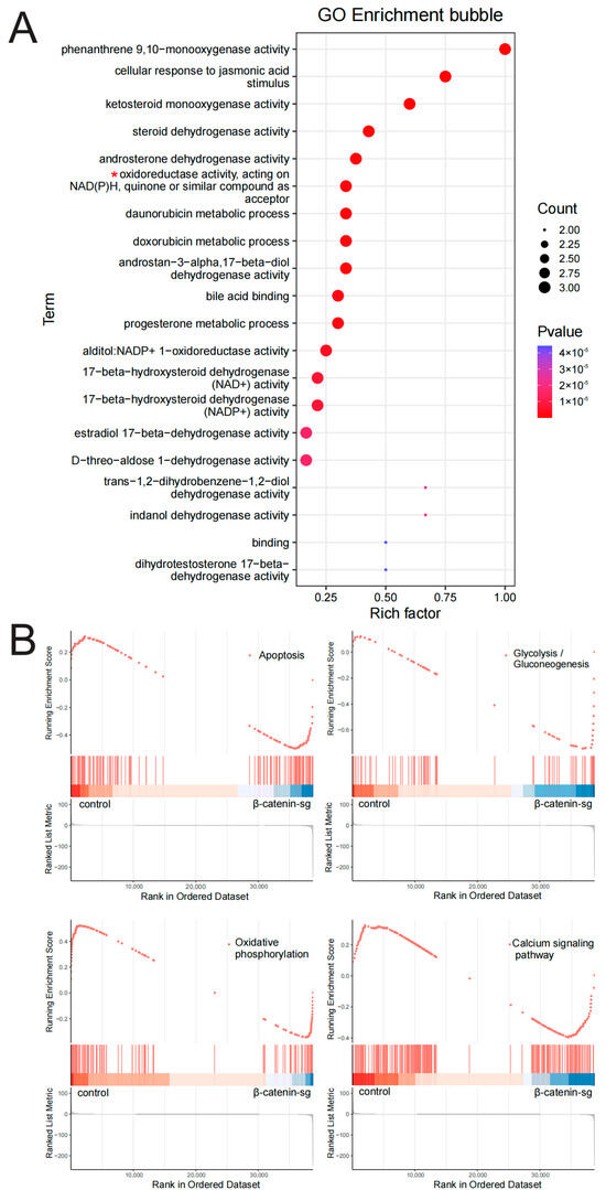 To elucidate the role of β-catenin in cell growth, proliferation, and metabolism of T-ALL cells, we investigated the global transcriptional profiles between β-catenin knockout and the control group. Gene Ontology (GO) functional enrichment analysis demonstrated that β-catenin is implicated in redox reactions (Figure 2A). Gene Set Enrichment Analysis (GSEA) indicated that β-catenin participates in the modulation of cell apoptosis, glycolysis, oxidative phosphorylation and calcium signaling pathway (Figure 2B). These results confirm that β-catenin plays a regulatory role in cell apoptosis and glycometabolism.