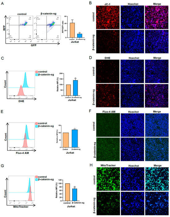 β-catenin deficiency induced mitochondrial impairment in T-ALL cells. (A) The mitochondrial membrane potential was determined using JC-1 staining by flow cytometry and (B) cells were photographed by fluorescence microscope. (C) The ROS level was quantified using DHE staining by flow cytometry and (D) cells were photographed by fluorescence microscope. (E) The cellular calcium levels were detected using Fluo-4 AM probe by flow cytometry and (F) cells were photographed by fluorescence microscope. (G) The mitochondrial mass was determined using MitoTracker staining by flow cytometry and (H) cells were photographed by fluorescence microscope (40×). * p < 0.05, ** p < 0.01.
