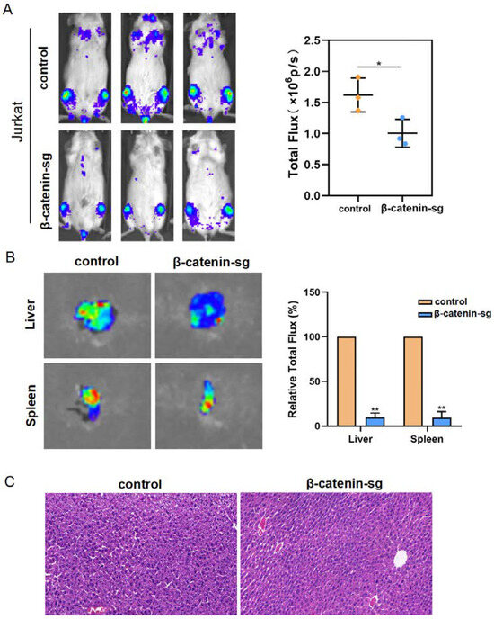To verify whether β-catenin stimulates leukemia cell infiltration, Jurkat cells expressing vector-luc or β-catenin sg-luc were injected via tail vein into immunodeficient mice. The whole-animal imaging analysis displays that the bioluminescence signal intensity decreased in the β-catenin deletion group compared to the vector group (Figure 5A). Moreover, the liver metastatic abilities were greatly decreased in the β-catenin sg group (Figure 5B,C). In all, these findings reveal that β-catenin promoted T-ALL cell infiltration in vivo.