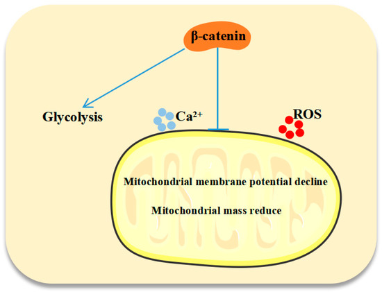 Mitochondria are the main organelles that provide energy for the production of ATP [28] and are involved in essential cellular processes, for instance, cell apoptosis, metabolite synthesis, Ca2+ homeostasis, and ROS production [29]. In addition, mitochondria are vital for the maintenance of hematopoietic stem cells (HSCs) and their normal function [30]. Mitochondrial dysfunction not only leads to impaired energy production, but also results in pathological conditions, including cancer [31,32]. However, the accurate role of β-catenin in regulating mitochondrial functions remains conflictive. Previous studies show that β-catenin has either stimulatory or inhibitory influences on mitochondria function [33,34]. Meanwhile, in perinatal cardiomyocytes, both the deletion and inhibition of β-catenin reduced the mitochondrial number, caused mitochondrial disintegration, and induced mitochondrial function impairment [26].