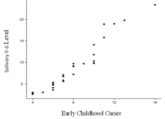 Figure 2). Overall, this study revealed a significant relationship between ECC, RC, and elevated salivary IL-6 levels, with higher IL-6 levels strongly associated with the increased severity of both ECC and RC. This study demonstrates a statistically significant relationship between the presence of ECC, RC, and salivary IL-6 levels when comparing the study and control groups. Additionally, it reveals a positive correlation between salivary IL-6 levels and the increasing severity of ECC and RC within the study groups.